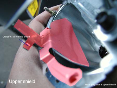 Locate the two small projector bowl shield tabs. I used a flathead screwdriver to lift/pry them. |